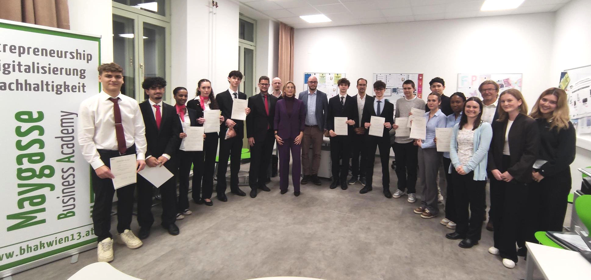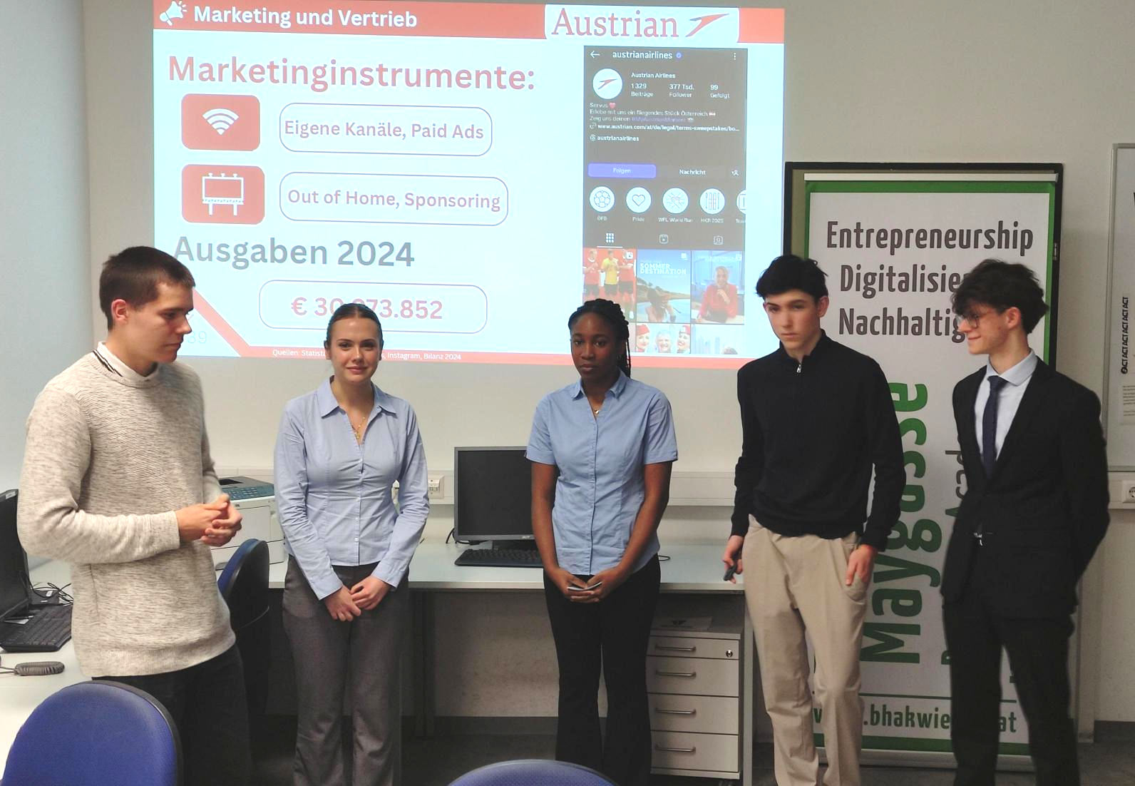 Am 18.11.2025 präsentierten die drei Teams des Kooperationsprojektes mit der Boston Consulting Group die Unternehmen AUA (2x) und Airbus. Die ausgiebige Recherche hat sich gelohnt. Geschäftsfelder, Trends, Marketing, Preise wurden von den Schüler:innen der 4. Jahrgänge analysiert und souverän vorgetragen. Die Jury war sehr gefordert, Qualitätsunterschiede zwischen den Teams zu finden. Kleine Details haben entschieden, das Team Airbus konnte diese Runde für sich entscheiden.