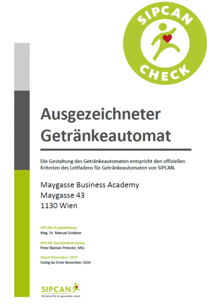 Das Waren­an­ge­bot wur­de nun im Rah­men des Schul­buf­fet-Checks vom vor­sor­ge­me­di­zi­ni­schen Insti­tut SIPCAN über­prüft. Die Kri­te­ri­en der „Leit­li­nie Schul­buf­fet“ des Gesund­heits­mi­nis­te­ri­ums wer­den an unse­rem Schul­buf­fet und bei unse­rem Kalt­ge­trän­ke­au­to­ma­ten erfolg­reich umgesetzt.