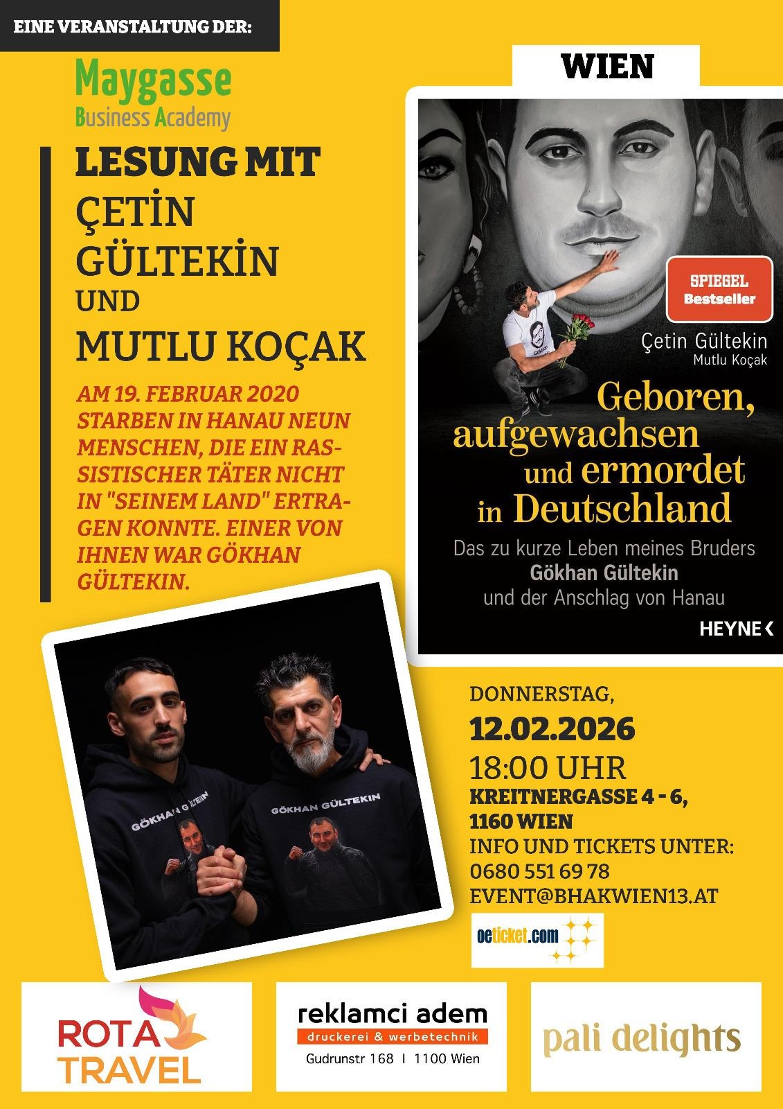 Am Donnerstag , 12.02.2026 — 18.00 Uhr veranstalten wir, die Projektgruppe RISL 4AKJK der BHAK Wien 13 eine Lesung und Gespräch über den Hanauer Anschlag vor 6 Jahren! Hierbei geht es um Sensibilisierung für Themen, wie Rassismus, Diskriminierung und Gewalt in unserer Gesellschaft.